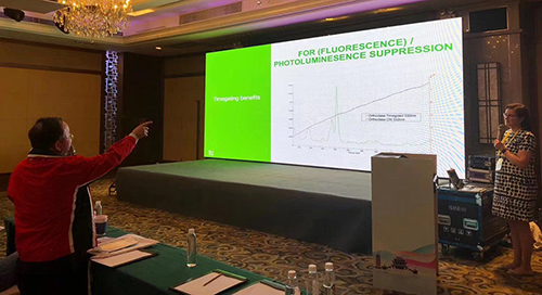 报告结束后,多位老师莅临富尔邦展台进行现场一对一的深入交流与答疑。详细的介绍了Timegate时间门控拉曼光谱仪在消除荧光干扰和高温黑体辐射干扰上的巨大优势!