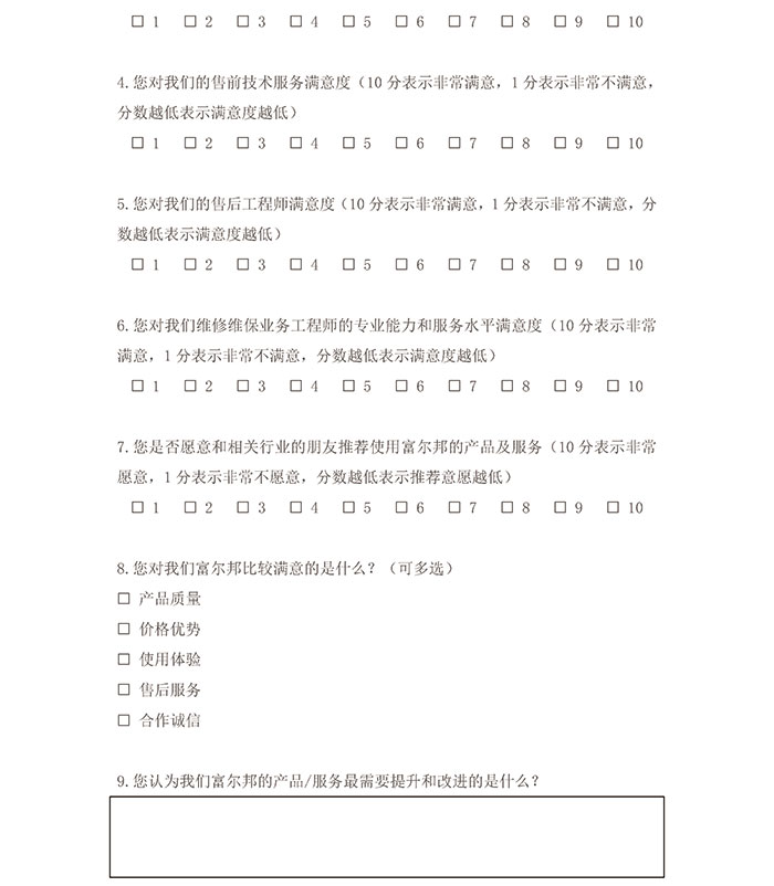 2020年即将结束,相信这一年大家都很不容易,富尔邦在客户朋友的关照支持下,在所有同事的艰苦努力下坚持了下来。在这不平凡的2020年,我们要特别感谢各位用户及朋友对富尔邦的信任和支持。“专业铸造诚信|服务赢得合作”是富尔邦始终坚持的理念。为了改进我们的工作,为了更好地满足您的需求,为了给您提供更好的产品和服务,诚邀各位尊敬的用户、朋友,占用您宝贵的几分钟填写“富尔邦用户满意度调查表”,我们会倾听所有的意见/建议,我们会在客户建议的基础上,对我们的管理、服务、产品质量进行改进和提升。我们深信:您的意见是我们改善的方向,您的信任是我们前进的动力,您的认可是我们努力的方向!